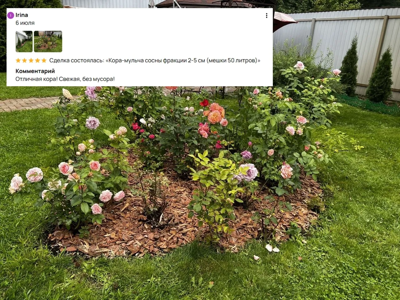 Особенности: Средняя фракция коры сосны, хорошо сочетается с различными видами растений и садовых элементов. Создает красивый декоративный эффект.